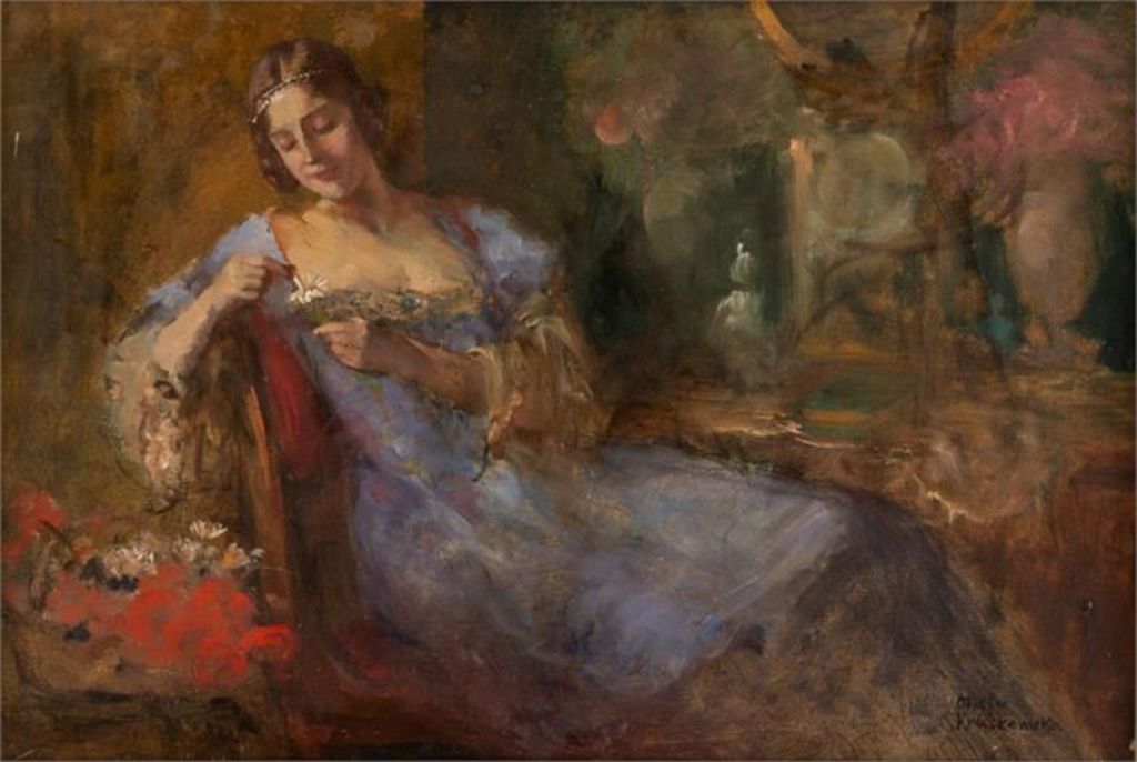 Lot 335. Otolia KRASZEWSKA (1859-1945). Elegant lady. Oil on paper on panel, signed, 34.5 x 50 cm. Opening 800 CHF. Galerie Moenius. 06/10/23. Sold 2,400 CHF