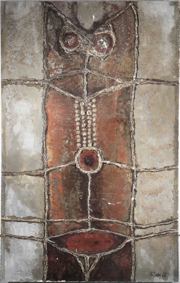 Lot 900. Krzysztofiak HILARY (1926-1979). Komposition aus der Serie Totems von Białystok 1965. Oil/canvas, signed and dated lower right Hilary (19)65, Polish painter and artist born 1926 in Szopienice Katowice – 1979 Falls Church Virginia USA, H 116 cm x W 73 cm, frame, abrasion, small missing parts. Opening €750. Antikauktion Krefeld. 06/07/25. Sold €2,800