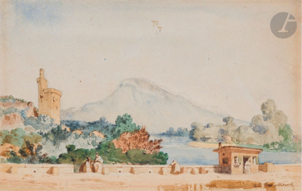 Lot 593. Teofil KWIATKOWSKI (1809-1891). Opposite: –View of Avignon, the Popes’ Palace and the Saint-Bénézet Bridge. Watercolor on paper. Signed lower left. Sight: 21 x 28 cm. Related work: Teofil Kwiatkowski, Avignon, oil on canvas, 1850, oil on canvas, 21.5 x 32 cm, Krakow, National Museum. -View of an abbey. Watercolor and gouache on paper. Sight: 17 x 26 cm. Estimate 600 – 800 euro. Conan Belleville Hôtel d’Ainay. 06/15/23. Sold 1,200 euro