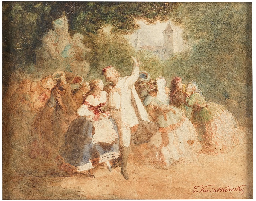 Lot 384. Teofil Antoni Kwiatkowsky (Pultusk 1809-1891 Avallon). Schlossgesellschaft beim Tanz im Freien, signiert T. Kwiatkowsky, Aquarell auf Papier, 11 x 14 cm, gerahmt. Estimate 500 – 800 euro. Dorotheum. 04/04/23. Sold 750 euro