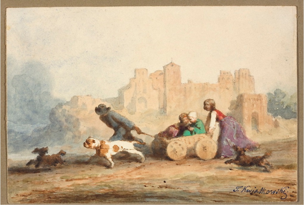 Lot 205. Teofil KWIATKOWSKI (1809-1891). La transhumance d une famille, au fond une ville fortifiée. Aquarelle, signée en bas à droite. 13,5 x 21,5 cm. Estimation: 300 – 400 €. Sade Commissaires-Priseurs. 07/08/21. Sold 600 euro