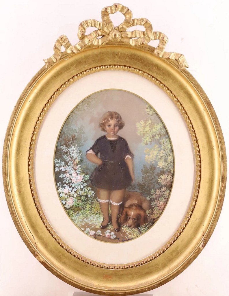 Lot 14. KWIATKOWSKI Teophile-Antoine (1809-1891). Portrait de jeune enfant et son chien, au parc fleuri. Pastel et gouache à vue ovale, signé en bas vers la droite. 33 x 26 cm (à vue). Cadre en bois doré sculpté, à décor d’une frise de perles et sommé d’un ruban noué (ptts accdts). Estimation: 500 – 700 €. HOTEL DES VENTES DE SAINT-DIE. 06/25/22. Sold 350 euro