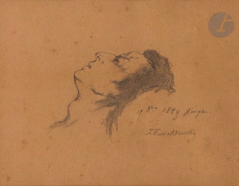 Lot 166. Teofil KWIATKOWSKI (1809-1891). Frédéric Chopin on his deathbed, 1849. Graphite. Signed, dated 17 8bre 1849 and located Paryz [Paris] in the center. 14 x 17.5 cm. Teofil Kwiatkowski, like many Poles, took refuge in France after the failure of the November 1830 uprising. Like Frédéric Chopin, he frequented the Czartoryski circle and the Hôtel Lambert. The painter rubbed shoulders with the composer and accompanied him until his death. As a witness to his final moments, he immortalized them in several drawings, all bearing the fatal date of October 17, 1849. Fryderyk Chopin, Fryderyk Chopin na łożu śmierci, 1849. Estimate 3,000 – 4,000 euro. Ader. 05/16/24. Sold 5,200 euro