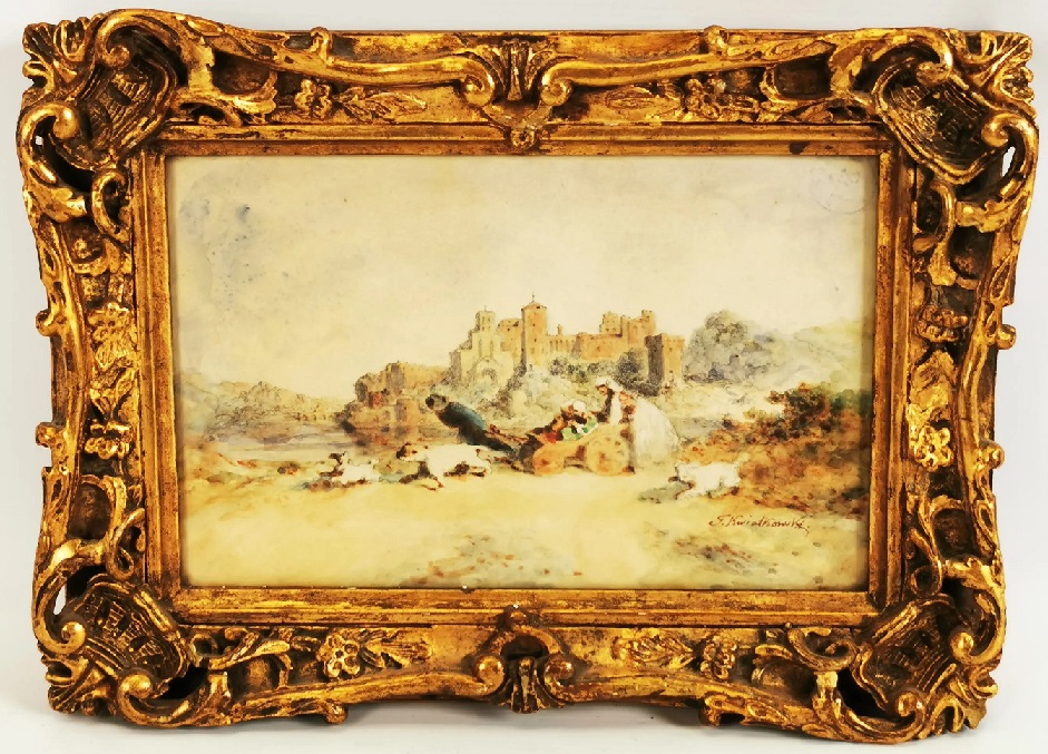 Lot 205. Teofil KWIATKOWSKI (1809-1891). La transhumance d une famille, au fond une ville fortifiée. Aquarelle, signée en bas à droite. 13,5 x 21,5 cm. Estimation: 300 – 400 €. Sade Commissaires-Priseurs. 07/08/21. Sold 600 euro