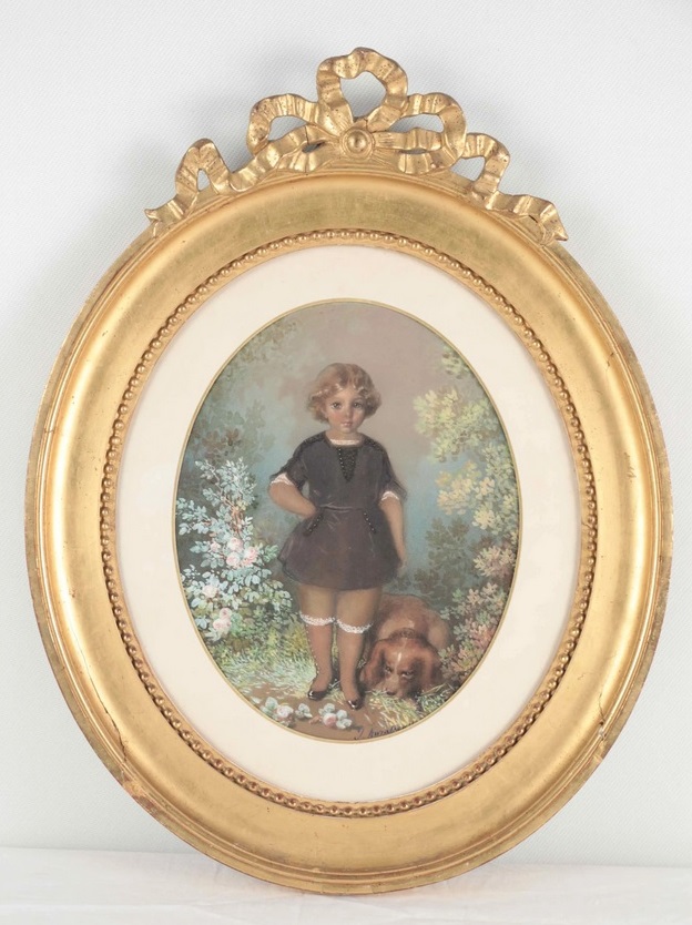 Lot 14. KWIATKOWSKI Teophile-Antoine (1809-1891). Portrait de jeune enfant et son chien, au parc fleuri. Pastel et gouache à vue ovale, signé en bas vers la droite. 33 x 26 cm (à vue). Cadre en bois doré sculpté, à décor d’une frise de perles et sommé d’un ruban noué (ptts accdts). Estimation: 500 – 700 €. HOTEL DES VENTES DE SAINT-DIE. 06/25/22. Sold 350 euro