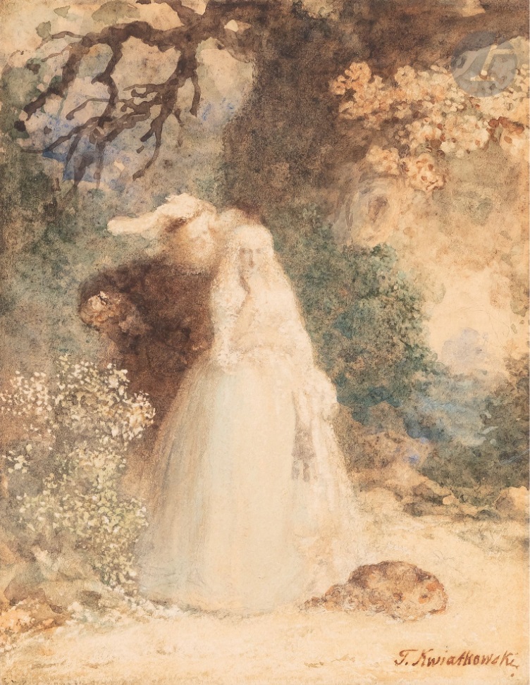 Lot 92. Teofil Antoni JAXA KWIATKOWSKI (Pultusk 1809 – Avallon 1891). Couple sous un arbre. Aquarelle sur traits de crayon noir, signé en bas à droite à la plume T. Kwiatkowki, porte une inscription au verso à la plume T. Kwiatkowski / Paris n° 65. Rue de rennes 15,3 x 11,9 cm. Estimate 200 – 300 euro. Thierry de Maigret. 05/20/22. Sold 1,000 euro