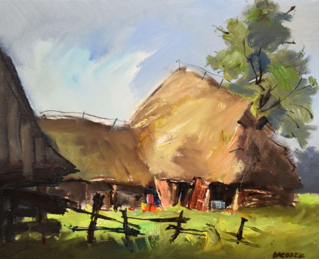 Kazimierz nad Wisłą to cudne miasto, które miało i ma szczęście do malarzy, począwszy chyba od Zygmunta Vogla z czasów króla Stasia. Również w latach 70-tych XX wieku działała tam Konfraternia artystów malujących bez końca to miasteczko. Jan Łazorek był jednym z nich. Jeden z pierwszych obrazów jaki znalazł się w moim posiadaniu był pejzaż z Kazimierza autorstwa Stefana Giemzy nalażacego do tej grupy, kupiony w Warszawie w galerii „Znak” na Świętokrzyskiej za dobre pieniądze. Kilka lat później żona kupiła inny obraz, bezpośrednio od tego artysty, na rynku w Kazimierzu za frakcję warszawskiej ceny galeryjnej. Mam obecnie przyjemnośc pokazania jeden z letnich pejzaży Stanisława Jana Łazorka z aukcji w Niemczech, bardzo nisko wyceniony. Bardzo podobne ujęcię na tę samą wieżę z przełomu XIII/XIV wieku, wykonane przez tego artystę jesienna porą, zostało dwa lata temu sprzedane w Sopockim Domu Aukcyjnym (fot poniżej).