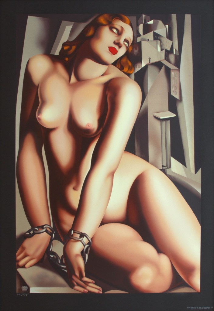 Otóż Sopocki Dom Aukcyjny wystawił na sprzedaż (aukcja 30 kwietnia 2022, lot 24) plakat współczeście wydrukowany, przypuszczam, że w latach 90-tych, przedstawiający kopię atrakcyjnej pracy Tamary Łempickiej ‘Andromeda‘ namalowanej w latach 30-tych. Udział samej artystki w wydruku tej papierowej kopii jest dokładnie zerowy, artystka już nie żyła i nie miała żadnego wpływu na proceder córki, Kizette. Kizette Lempicki postanowiła sobie dorobić na boku zlecając wydrukowanie na drukarce, z użyciem pewnie dobrego atramentu i dobrej jakości papieru, szereg kopii różnych prac matki z lat 30-tych. Te policzyła, ponumerowała, podpisała swoim nazwiskiem, przyłożyła suchą pieczęć ze swoim nazwiskiem i zaczęła je sprzedawać jako certyfikowane przez nią wydruki. Uchodzą te wydruki drukarkowe jako dzieło artystyczne, za które nawet pobierana jest opłata autorska (ca 5% od wartości sprzedaży). Sprawdziłem, że można zlecić druk identycznej jakości kopii i kosztuja one do $500. Też drogo ale jak ktoś ma kaprys to czemu nie.