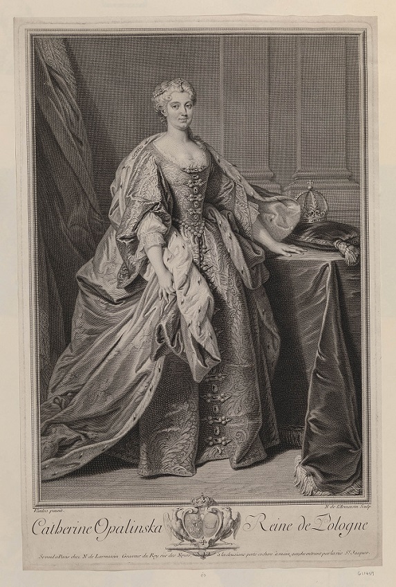 Engraving of Catharina Opaliński, Queen of Poland. Whole length with curled hair with jewelled claps, lace tucker, embroidered gown, jewelled bodice, and ermine mantle. The Queen is pictured standing holding a her mantle in right hand with left hand resting on a table beside a crown, with drapery behind. With coat of arms and French inscription below. 52.5 x 34.2 cm (sheet of paper). (by Royal Collection Trust)