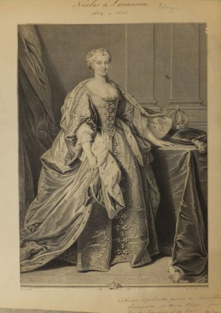 Jako uzupełnienie poprzedniego wpisu przedstawiam portret Katarzyny Opalińskiej (1680 – 1747), żony króla Stanisława Leszczyńskiego. Sztych oparty jest na oleju wykonanym za życia królowej ok 1725 roku przez (wg katalogu aukcyjnego) Carle van Loo(?). Oryginalnego oleju nie potrafiłem odszukać a co do imienia malarza podanego w katalogu mam wątpliwości, gdyż van Loo to była rodzina malarzy (ojciec i dwóch synów) a imię malarza przypisanego do tego portretu to najprawdopodobniej Jean-Baptist (van Loo). Engraving jest w takim sobie stanie: ma obcięte marginesy a zatem nie należy się bardzo nim ekscytować. Ten sam sztych w dobrym stanie przedstawiam poniżej.