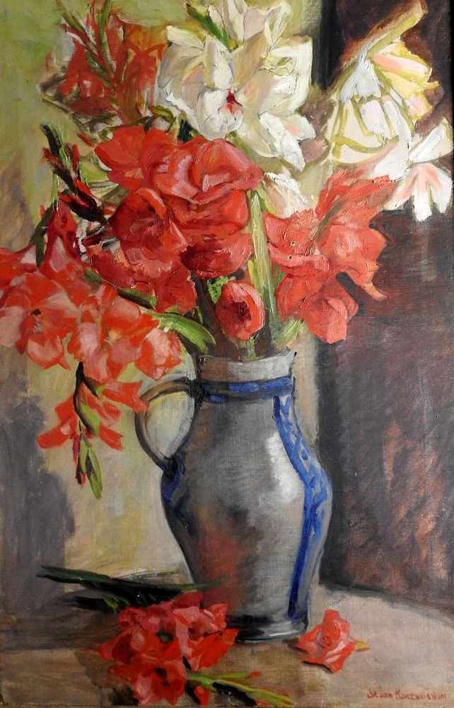 Stanisław Korzeniewski. Das Blumenstillleben zeigt weiße und rote Gladiolen in einer bauchigen Vase