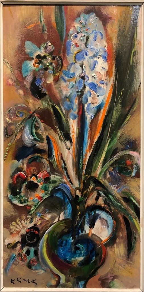 Lot 40.Ludwig KLIMEK (1912-1992). Bouquet de jacinthes. Huile sur isorel, signée en bas à gauche, 30 x 60 cm. Estimate 400 – 500 €. Aguttes. 01/07/21