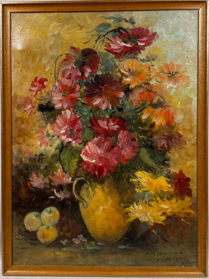 Lot 331. Anna OLSZEWSKA (1943-2000). Vase of flowers and three apples. Oil on canvas signed lower right. 84,5 x 62 cm. (slight indentation in the upper left corner). Estimate 40 – 60 euro. Hotel des vendes Giraudeau. 01/27/21