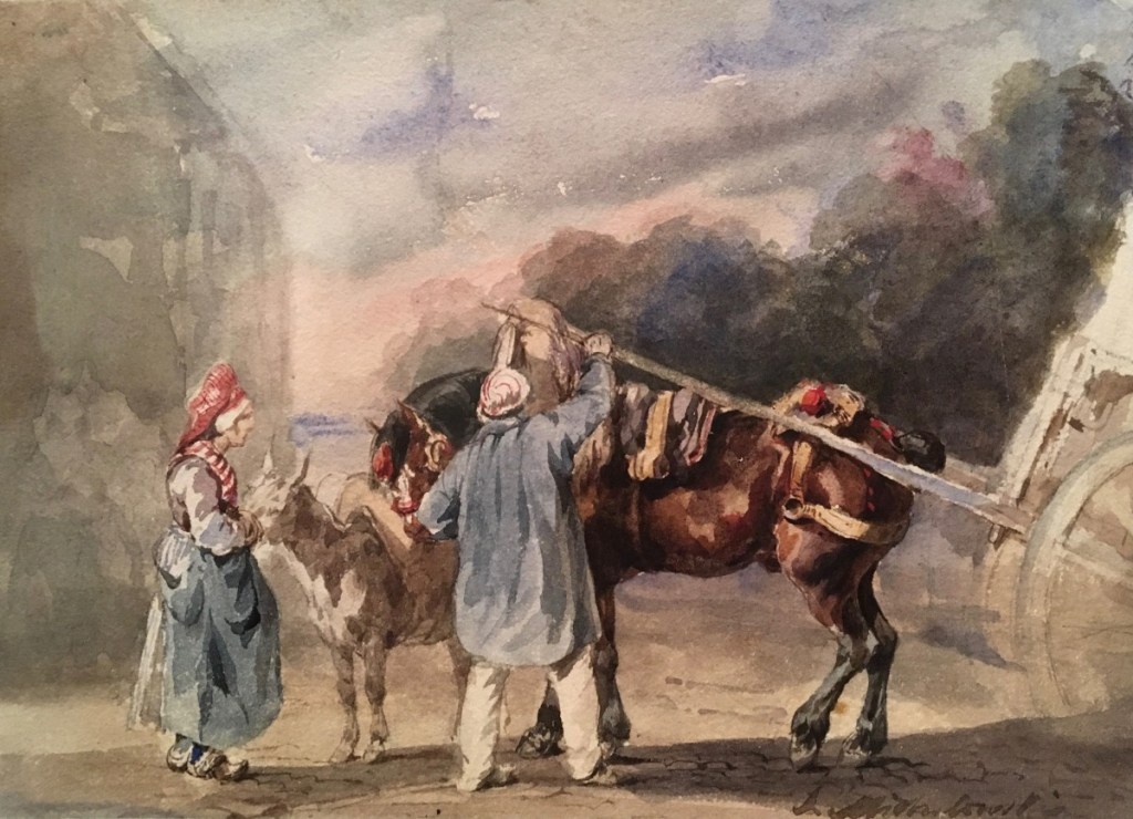 Lot # 22. Piotr MICHALOWSKI (Cracovie 1800 – 1855) L’attelage. Aquarelle. Signée en bas à droite. Haut. 15,8, Larg. 21,7 cm. Estimate 200-300 euro. Maître Philippe ROUILLAC et ROUILLAC, 02/18/18.