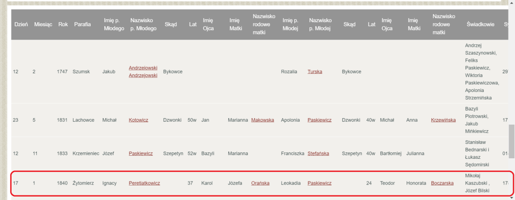 Próbowałem odszukać informacje o tej parze małżeńskiej i jedyne to co mi się udało to w księgach parafialnych zapis z 17 stycznia 1840 roku o małżeństwie ich córki Leokadii Paskiewicz z Ignacym Peretiatkowiczem w parafii w Żytomierzu.