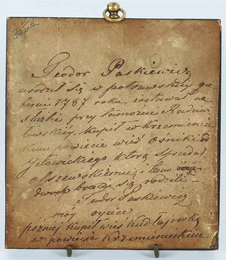 Teodor Paskiewicz: Teodor Paskiewicz urodził sie w połtawskiej guberni 1787 roku zostawał na służbie przy …., kupił w krzemieneickim powiecie wieś Ośniki od Jełowieckiego którą sprzedał Olszewskiemu i tem bracia(?) się …(?). Później kupił wieś Kudłajówkę w powiecie Krzemienieckim.