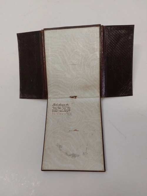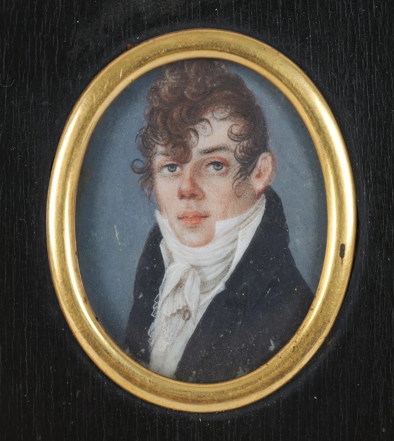 Lot 460. Kolakowski, Stanislaus Severinus: Active in Poland, c. 1810. Tempera. Portrait of a young, noble gentleman, facing the viewer in a black frock coat and red-lined cloak. In the background a view of the sky. Signed on the right side. Oval image section. Verso adhesive label with the artist’s name and ‘vertreten in der Sammlung Emden (Hamburg)’ inscribed. 9.5 x 8 cm. Rectangular leather frame with brass inner strip, in foldable leather case with flap. 14 x 11 cm. Opening €400. Peege. 07/16/25. SOld €400