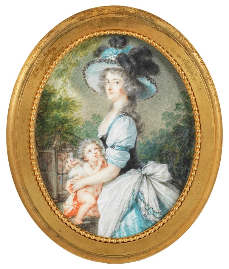 Lot 1183. WINCENTY DE LESSEUR-LESSERWOICZ (1745/46–1813). Oval portrait of a coquettish young woman dressed in a low-cut white dress and a red scarf, and wearing a white hair-band in her frizzy hair. In a fine gilt metal frame. Verso with old collection number D.-W. 562. 6.3 × 5 cm. Cracks on the left side. Provenance:- Collection D. David-Weill (1871-1952), Neuilly-sur-Seine, No. 562. – Collection Sir Charles Clore (1905-1979) . – Sotheby’s Auction, 10 November 1986, Lot No. 32. – Swiss private collection. Exhibition: Garrard London: An exhibition of important 18th Century and early 19th Century Miniatures and Enamels at Garrard, 1961, No. 231. Literature: C. Jeannerat and H. Clouzot, Miniatures and Enamels from the David David-Weill Collection, Paris, 1957, p. 342, No. 231.