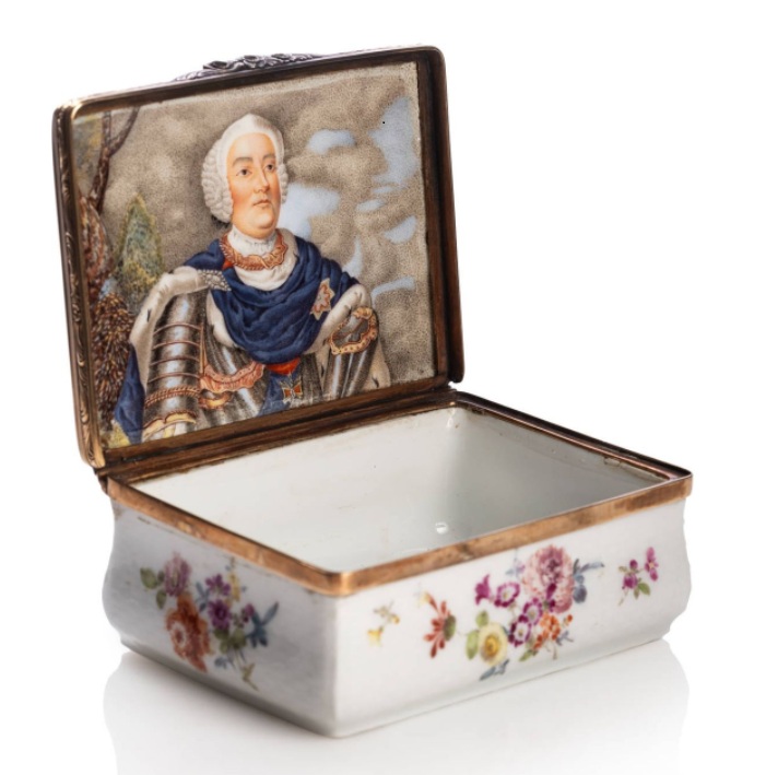 Lot 218. MEISSEN. Rectangular, baluster-shaped, hard porcelain snuffbox mounted in gold (375 thousandths), with polychrome decoration of bouquets of flowers, the lid imitating wickerwork and hinged, the interior painted with a bust portrait of Auguste III (1696-1763), King of Poland and Elector of Saxony, after an official portrait painted by Louis de Silvestre. Crack on the lid. Meissen Manufactory, mid 18th century. No apparent mark. H. 3.5 x W. 8.5 x D. 6.7 cm. Gross weight: 160.9 g. Related work .A porcelain snuffbox with polychrome decoration, the interior decorated with the portrait of Auguste le Fort, Manufacture de Meissen, circa 1723-1725 (Swiss private collection). Estimate €2,000 – 3,000. Millon. 04/25/25