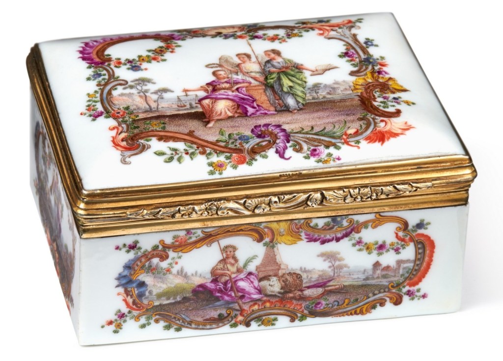 A Meissen porcelain snuff box, circa 1755, with silver-gilt mounts by James Aldridge, London, 1827. rectangular, the lid and each side painted with allegorical scenes framed by colourful rocailles heightened in gilding and entwined with floral garlands, the lid interior finely painted with a portrait of King Augustus III of Poland and Elector Frederick of Saxony (1697-1763), possibly by Johann Martin Heinrici after Anton Raphael Mengs (1728-1779), the base interior painted in purple monochrome with a tresllis pattern enclosing AR monograms, silver-gilt mounts chased with rocailles and flowers, fully hallmarked, 8.5 cm; 3 ⅜ in. wide. Estimate CHF 15,000 – 26,000. Sotheby’s. 05/06/25