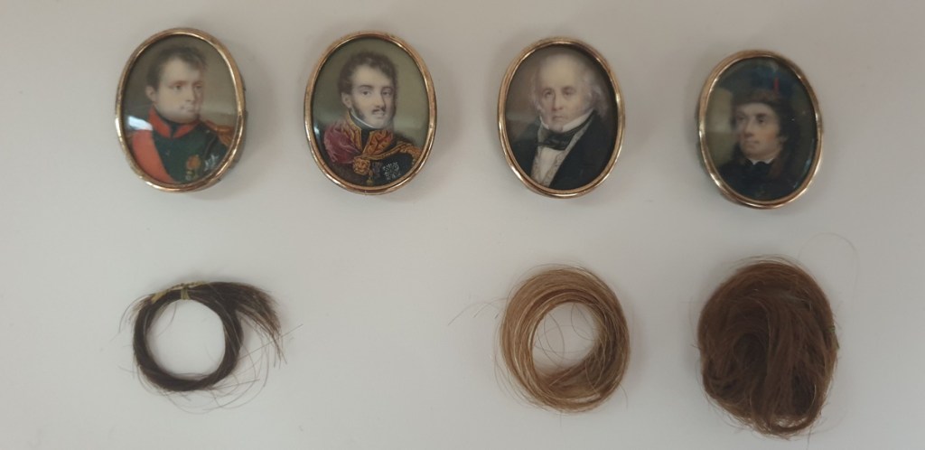 Pod trzema miniaturami znajdują się skrytki z puklami włosów, a pod wizerunkiem Napoleona – karteczka z napisem po francusku: „Włosy Cesarza, Napoleona, obcięte na wyspie Św. Heleny.”