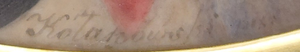 Obawiam się, że bez pomocy autora portalu miniatury, p. Marka Klimka (https://miniatury.wordpress.com/) nie uda się ustalić się autorstwa tej pracy. Wydaje mi się, że niemiecki dom aukcyjny może się mylić podając nazwisko malarza jako Kolakowski (ew. Kołakowski). W Słowniku Malarzy Polskich nie ma takiego hasła artysty. Po trudach powiększania i obróbki sygnatury wyłania mi się nazwisko Kolanowski, natomiast po nazwisku nie mamy daty lecz jakaś forma słowa ‘pinxit’. Kolanowski to nazwisko popularne w województwie poznańskim i żyło tak kilka znanych osób. Nie ma natomiast śladu o malarzu miniatur. Czytelnicy zwykle nie zawodzą i liczę na rozwiązanie zagadki nazwiska malarza i jego biografii.