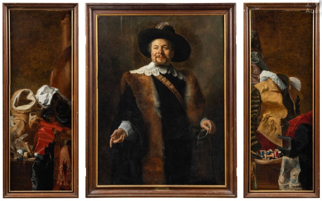Lot 75. André Jerzy MNISZECH (Wischnowitz 1823 -1905 Paris). Portrait of Hendrick Clootens, cutter Panels in triptych 150 x 112 cm and 150 x 57 cm for the flaps Monogrammed on the main panel and dated 1887 and on the flaps 1888 This spectacular triptych, painted by Count Andrej-Jerzy Mniszech, a painter of Polish origin who settled in Paris in 1852, depicts a tailor and bootmaker named Hendrick Clootens. Proudly camped and richly dressed in the Dutch fashion of the 17th century, he occupies the central panel, surrounded on either side by the tools and attributes of his dual profession. On the back of the side panels, the two painted signs indicating his name and trade dominate a cityscape with smoking chimneys, symbols of the industrial and commercial development to which Hendrick industrial and commercial development to which Hendrick Clootens owed his prosperity. In 1883, five years before our triptych, Mniszech had painted a Portrait of Henryk Clootens (National Museum, Warsaw). The dedication on this portrait: Henricus Clootens civis Bruxellensis, sartor atque sutor celeberrimus, natus 1584 – obiit 1662, resurrexit 1839, ad vivum pinxit 1883, tells us that the model of our triptych was a famous bootmaker living in Brussels in the seventeenth century, and that the 1883 portrait depicts a descendant (or simple homonym?) who was probably also a bootmaker and contemporary of Mniszech.