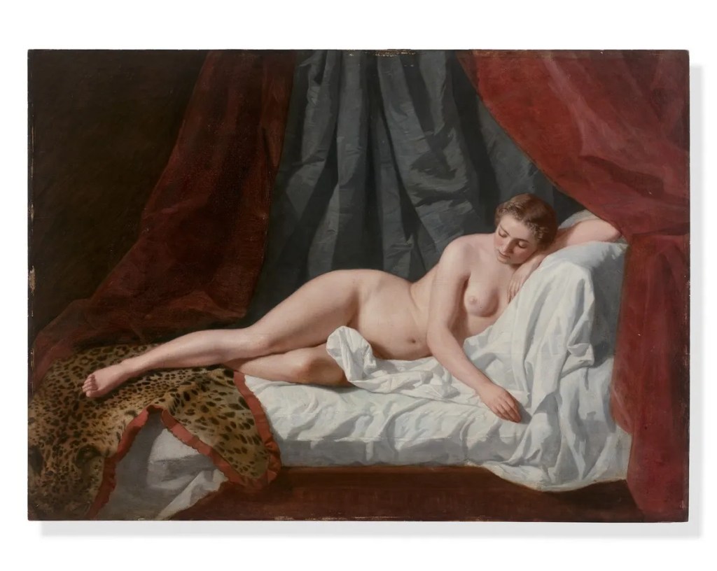 Lot 186. André Jerzy MNISZECH Wischnowitz, 1823 – Paris, 1905. Jeune femme alanguie dans une alcove. Panneau parqueté (Restaurations). A young woman reclining in an alcove, panel, by A. J. Mniszech; h: 83 w: 116 cm. Provenance : Acquis dans le commerce parisien par les parents de l’actuel propriétaire dans les années 1930 (comme attribué à Winterhalter); Collection particulière du Sud-Ouest de la France
