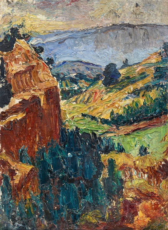 Lot 198. Mela Muter (Maria Melania Mutermilch), Berglandschaft. Oil on panel. 40.5 x 30 cm. Framed. Unsigned. Galerie Bargera, Cologne, label verso, therein work information and inscribed “No 41”. – Retouchings in the impasto dark areas and a few small paint losses. Wooden panel minimally convex curved. Estimate 12,000 – 15,000 euro. Lempertz. 11/30/24. Passed
