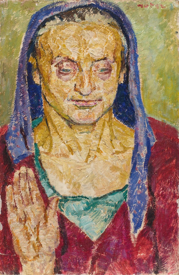 Lot 200. Mela Muter (Maria Melania Mutermilch), Alte Frau. Oil on panel. 55.2 x 33.4 cm. Signed ‘Muter’ upper rigt in red. – Numbered “47” verso in black brush. Label of Galerie Bargera, Cologne verso, therein work information and inscribed “No 43”. – Faint abbrasion at the margins, two small losses to the left. Otherwise very good and colour fresh condition. Estimate 12,000 – 15,000 euro. Passed