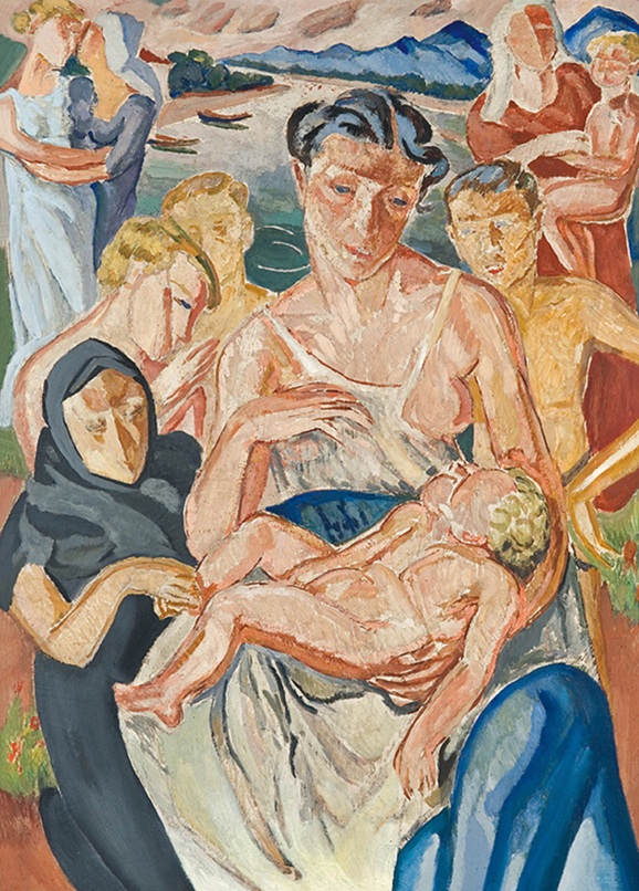 The painting presented here, Maternité, was painted around 1940/1950 in Avignon. During the Second World War, Mela Muter lived in hiding in Avignon. She was helped and sheltered by a number of families and residents. The painting appears to have been executed from her studio on the Rocher des Doms. The view over the Rhône is superb. Avignon’s geography is illustrated by the boats resting along the banks of the Rhône below, while the relief of Mont Ventoux is sketched in the distance.