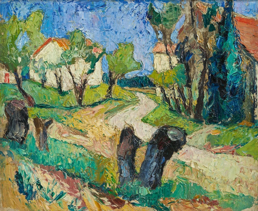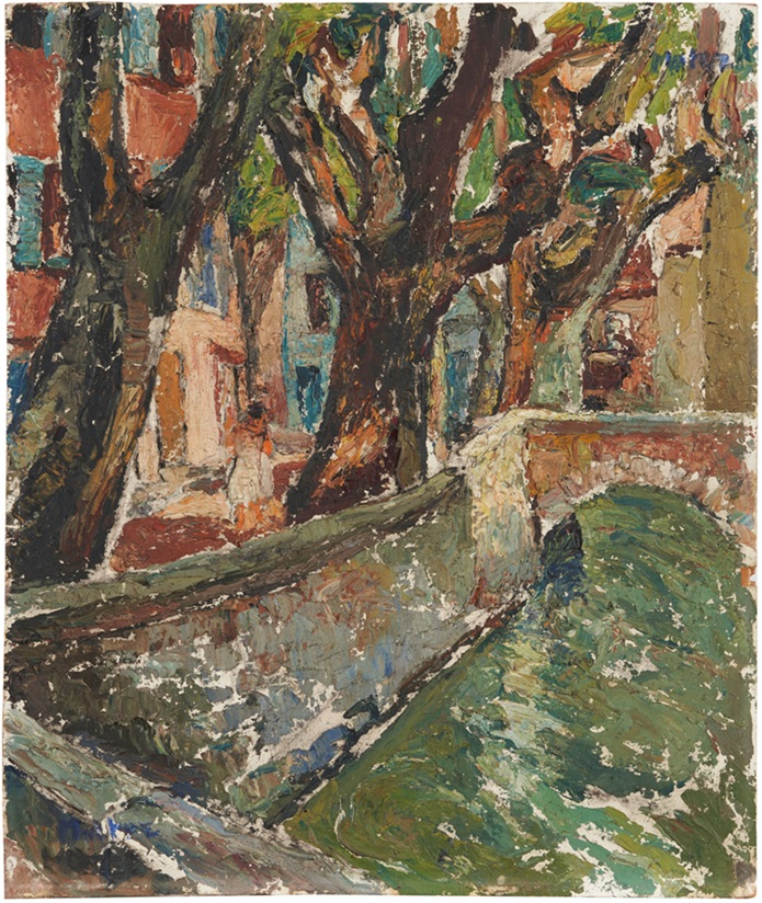 Lot 104. MUTER, MELA1886 Warschau – 1967 Paris. Rhôneufer mit Booten, 1936. Oil on wood.45 x 54cm.Signed lower left: Muter.Craftman’s frame. On the reverse is another painting, ‘Landscape with Houses‘. Provenance: – Kunsthaus Lempertz, Cologne, 847th auction, 26th November 2003, lot 876 (label); – Private collection, North Rhine-Westphalia. Estimate €15,000 – 20,000. Van Ham. 12/03/25. Sold €30,000