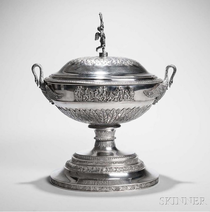 Lot 199. Polish .750 Silver Covered Tureen and Stand, Warsaw, mid-19th century, Ludwik Nast, maker, in the neoclassical style, the urn-form tureen with a cupid finial, two swan-form handles, and a central applied figural motif featuring musicians, on an oval foot further raised on an oval base with die-cast registers, total ht. 22, wd. handle to handle 19 in., approx. 222.4 troy oz. Estimate $10,000-15,000. Skinner. 01/12/17 (1711070)