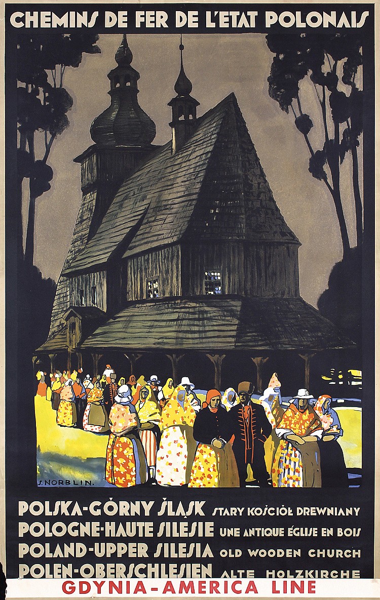 Norblin “was well-known for his poster designs for the Polish tourist industry. His poster work is distinguished by its unconstrained expression of subject matter, fine hand and intense color. It depicted specific Polish regions, towns and historical buildings for the Ministry of Transportation” (Polish Poster p. 87). Here, we see a view of the old buildings and spires of Warsaw seen from the Vistula river. Gebrauchsgraphik April 1, 1936, p. 43.