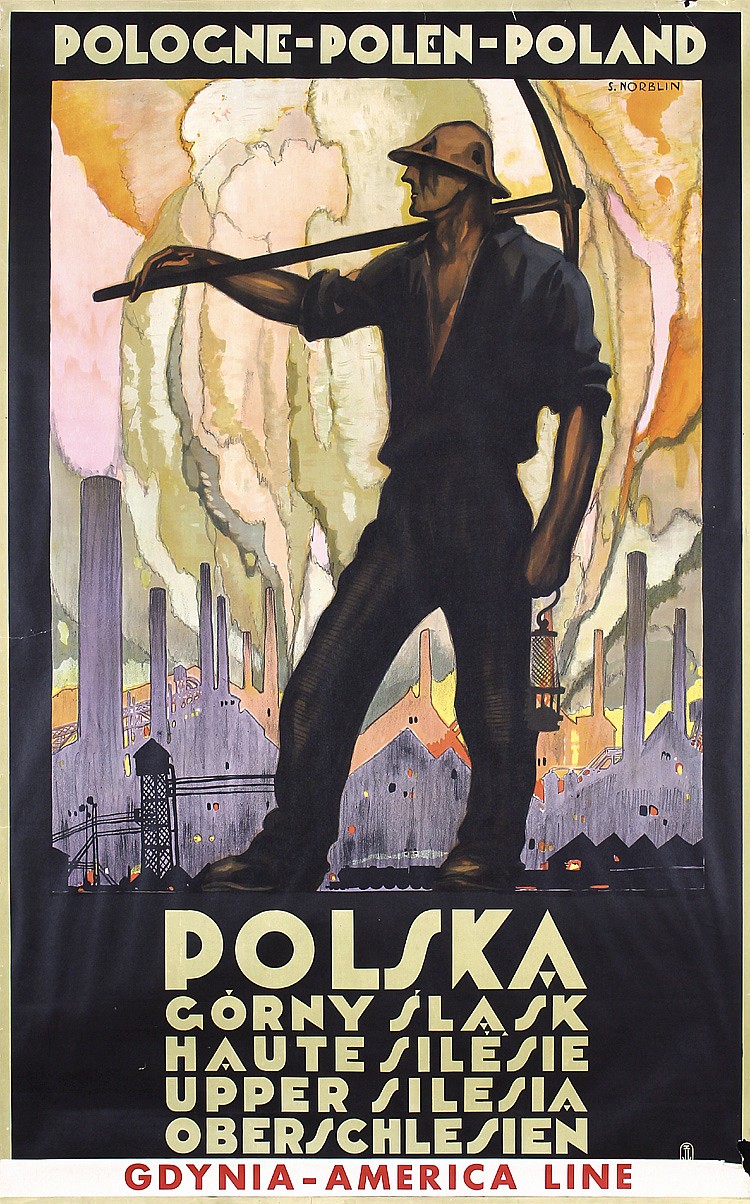 Lwòw has had a tumultuous geo-political history. Historically a prominent Polish, Ukrainian and Jewish city, it was one of the intellectual centers of Eastern Europe. Over the centuries, it has been fought over and claimed by the Hapsburgs, Russians, Poles and Germans. Poland took control of the city in late 1920, and it was part of Poland until the beginning of the Second World War when it was retaken by the Soviets and then again by the Germans. Norblin, in a silhouette style reminiscent of posters by Ludwig Hohlwein, depicts some of the city skyline’s most prominent structures: The Bernadine Cathedral and Monastery, the Clock Tower and the domes of the Assumption Dormition Church and the Dominican Church, amidst other spires and steeples. In addition to its size, architecture and cultural prominence, Lwow is now also infamous for the Jewish Ghetto established there during the Second World War, which was liquidated in June 1943. Simon Wiesenthal was one of the most prominent of the ghetto’s few survivors. Polish Poster 92, Biblioteki Glownej 178, Polska Sztuka Plakatu p. 79.