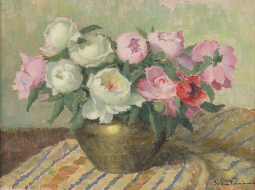 Lot 1082. Nowotnowa, Janina(1881 Tarnów – 1963 Krakau). “Blumenstillleben“,Öl auf Karton, signiert unten rechts Janina Nowotnowa, 40 x 54 cm; polnische Malerin und Grafikerin, ihre Werke befinden sich unter anderem in den Nationalmuseen in Warschau, Krakau und Breslau. Starting 300 euro. Pluckbaum. 02/24/24. Sold 600 euro