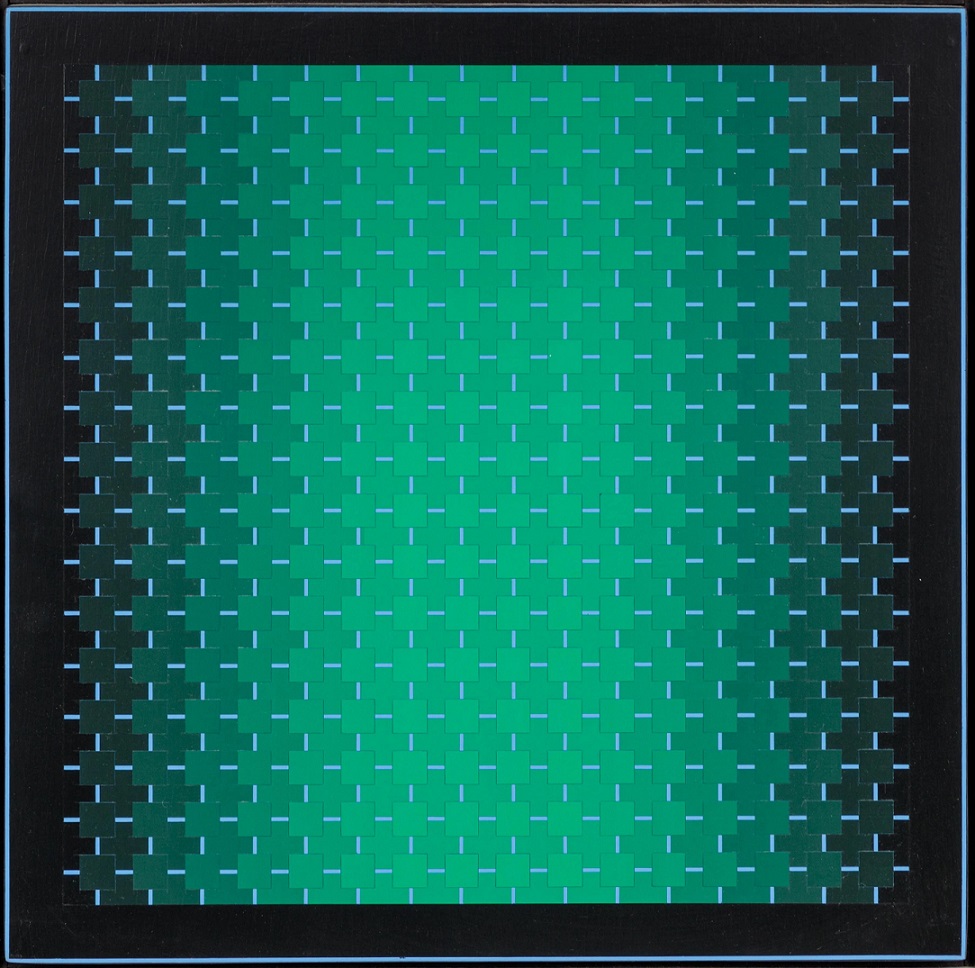 Lot 70. Julian Stanczak (American, 1928-2017). Harmony Green , 1991, acrylic on panel, signed J. Stanczak, titled and dated (verso), 14 x 14 inches. Estimate $10,000 – $15,000. Hindman. 05/21/20