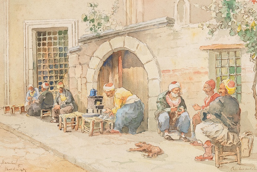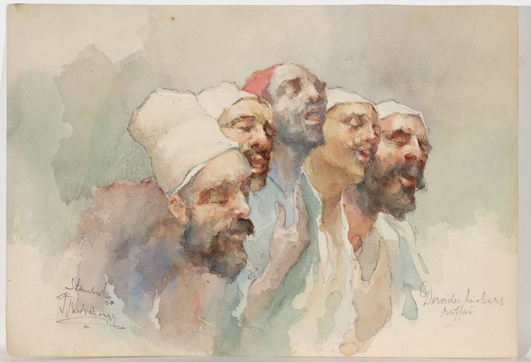 Lot 119. JÓZEF PAWLIKIEWICZ, PROBABLY ANNA MAY-RICHTER (1864-1955). Reunion of three drawings Man in front of Saint Sophia – The call to prayer in Turkey – Dervishes singing. Watercolor and graphite on paper/ Signed and two located ‘Stanbul (Istanbul)’ lower left and right (Traces of adhesive and some foxing). A set of three drawings, watercolor and graphite on paper, signed and located lower left and right 45 x 30,5 cm – 17 3/4 x 12 in. 45 x 29 cm – 17 3/4 x 11 3/8 in. 30 x 44 cm – 11 3/4 x 17 3/8 in. Provenance Private collection, France