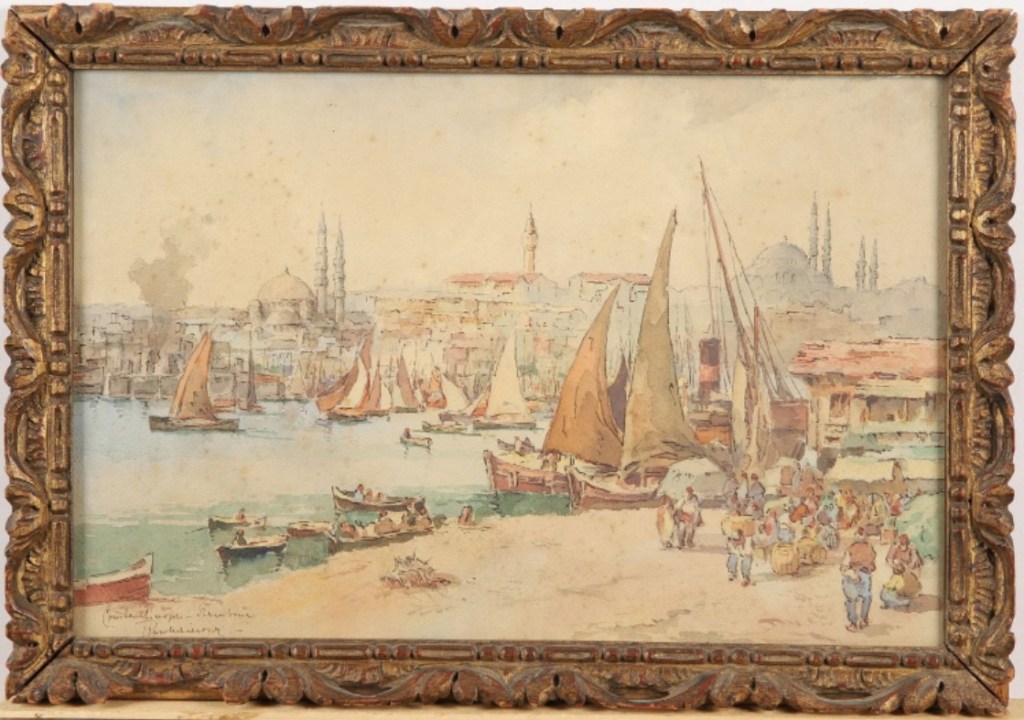 Lot 9. Ecole russe ou polonaise de la fin du XIXe siècle, variante d’une oeuvre de Georg MACCO (1863-1933). Vue de la Corne d’or à Constantinople. Aquarelle sur papier, signé et situé en bas à gauche : “Constantinople – Stamboul / Paw” Encadré 26 x 40 cm. Estimate 200 – 300 euro. Boisgirard – Antonioni. 04/20/23. Sold 250 euro