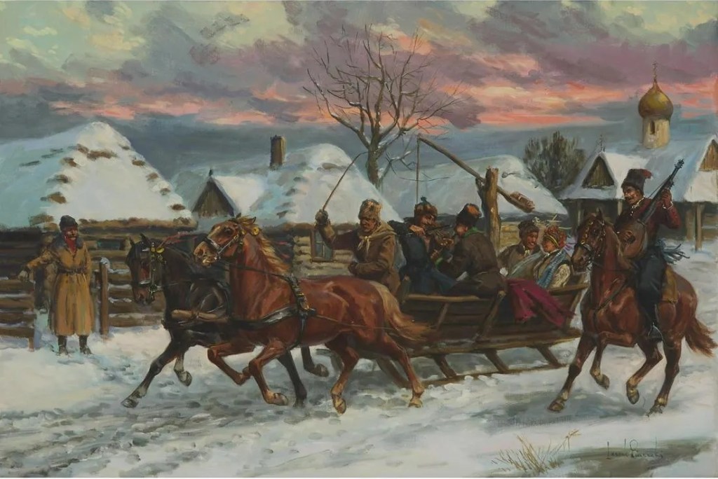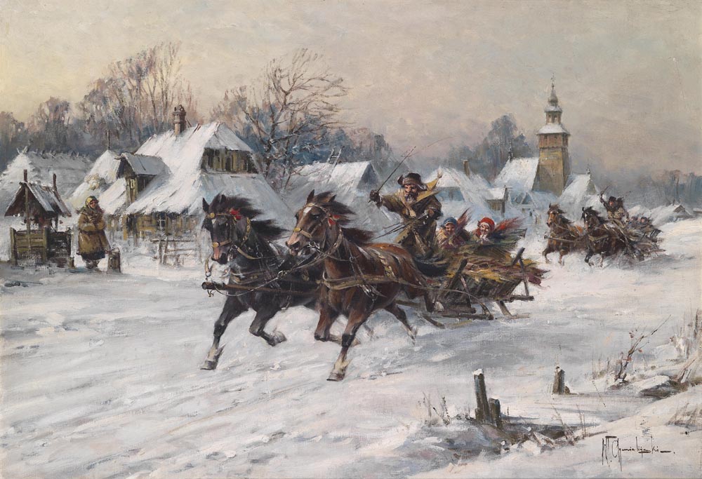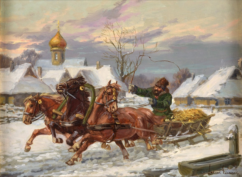 Leszek Piasecki. MUSICIANS IN A SLEIGH RACINGTHROUGH A SNOWY VILLAGE