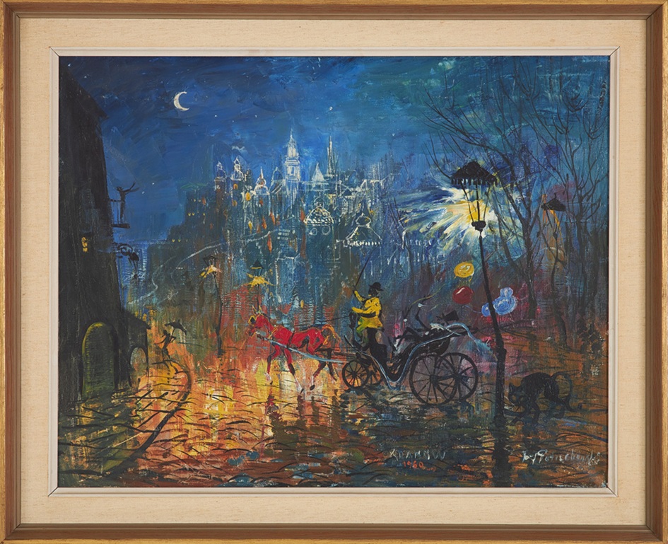 Zaczarowana dorożka to temat powtarzany przez Jerzego Potrzebowskiego, zwykle o różnych kolorystykach i w różnych sytuacjach, choć dorożka na tle bramy to najczęstszy chyba motyw. Połączenie jego malarstwa z poezją nigdy jednak nie nudzi i wcale mnie nie dziwi, że jego twórczość cieszy się sporym zainteresowaniem. Jerzy Potrzebowski przeźył piekło niemieckich obozów koncentracyjnych