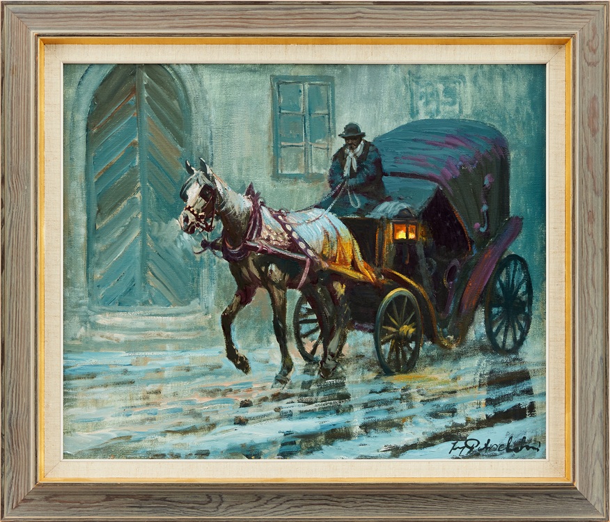 Lot 339. Jerzy Potrzebowski Polen 1921-1974. Hästdroska genom staden. Signerad Jerzy Potrzebowski. Olja på duk, 50 x 61 cm. Estimate 3.000 – 4.000 SEK (€ 270 – 360). Uppsala Auctions. 08/19/25. Sold SEK 11,000