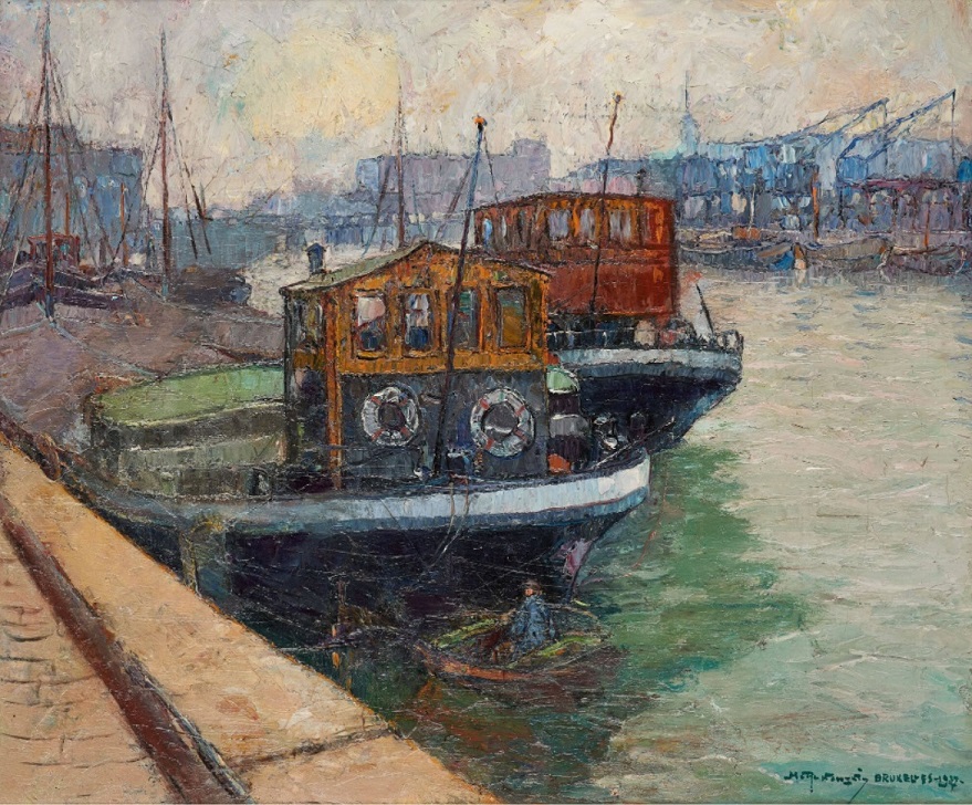 Lot 360. Mecislas RAKOWSKI École polonaise (1882-1947). Oil on canvas: Barges at the quay. Signed, located and dated: M. Rakowski Bruxelles 1937. (restoration in the sky). Size: 54 x 65 cm. Estimate 800 – 1,200 euro. Horta. 01/23/24. Sold 1,300 euro