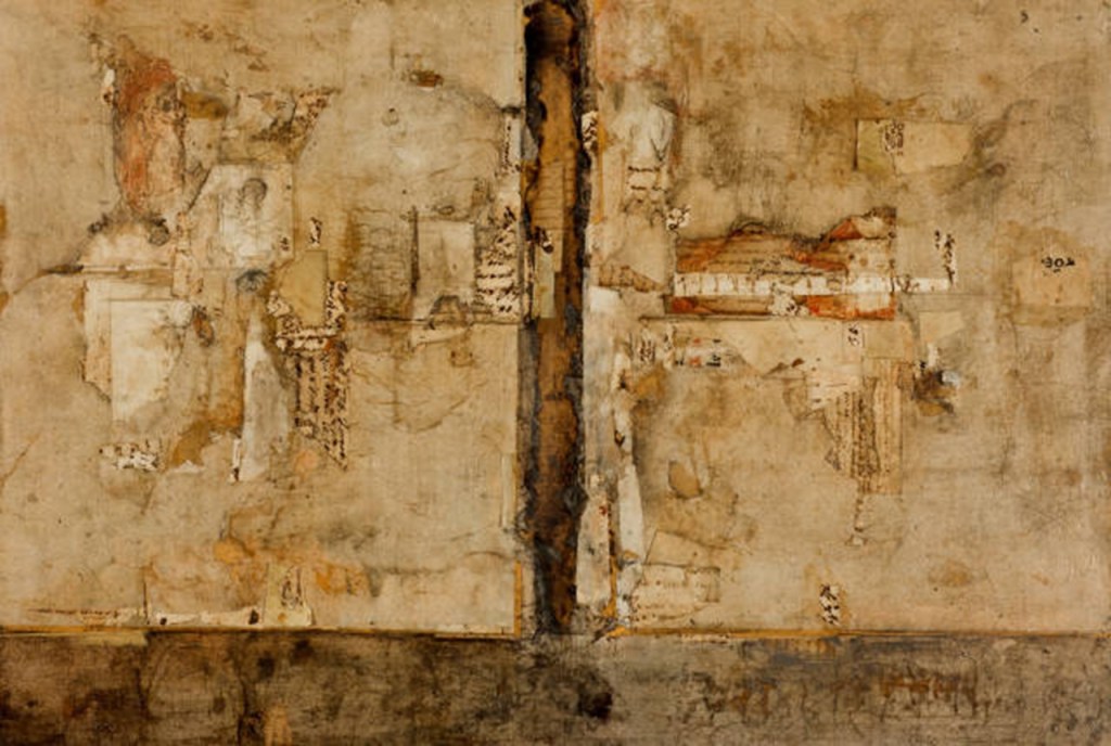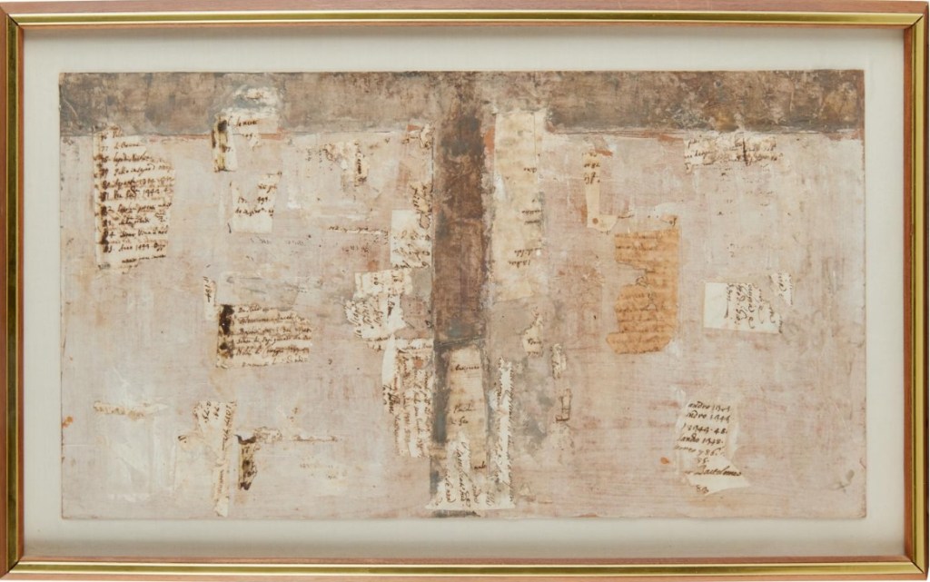 Lot 1594. Teresa Rudowicz Toruń 1928 – 1994 Krakau. Ohne titel. 1959. Öl und Collage auf Karton, auf Leinwand aufgezogen, 49×73,5 cm. Rückseitig auf der Leinwand von der Künstlerin signiert und datiert “59/14”. Estimate CHF 2,500. Kornfeld. 09/09/25. Sold CHF 2,800