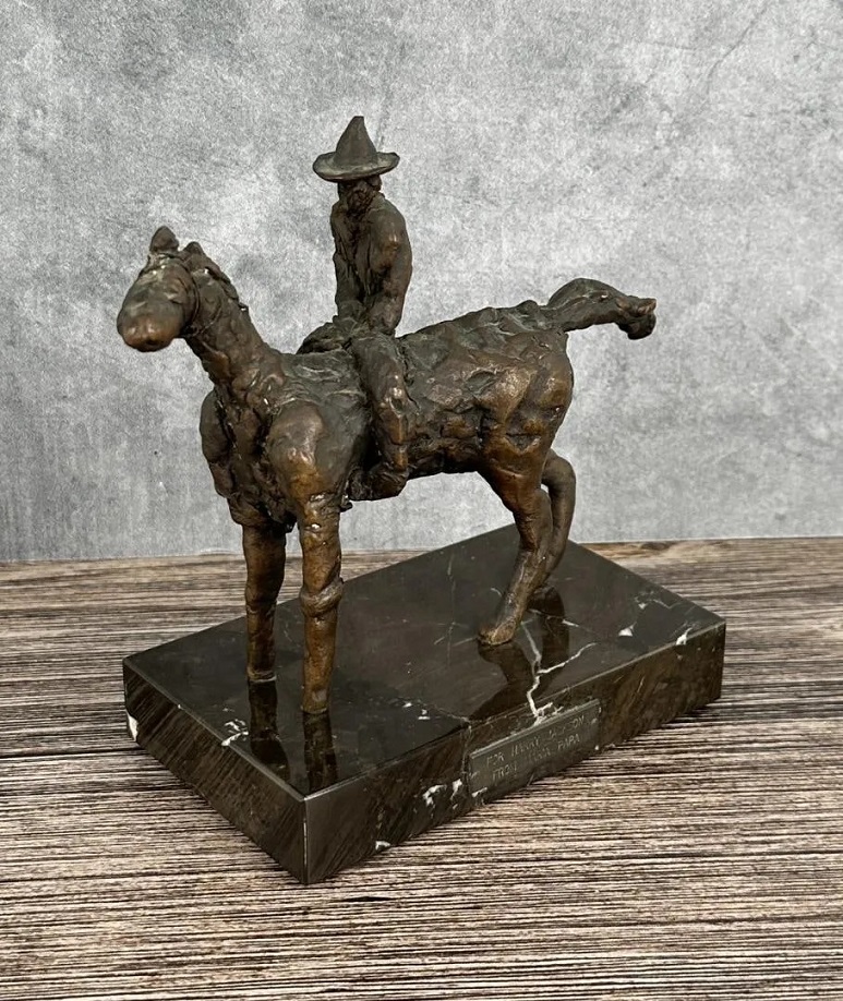Lot 860. Maria Papa Rostkowska Bronze for Harry Jackson. 6″ long, 5 5/8″ tall, 2 7/8″ wide. Provenance: Harry Andrew Jackson Estate. Maria Papa (1923 – 2008) was active/lived in Poland. Maria Papa is known for Sculpture. Maria Rostkowska had just started her technical drawing and architecture training in Poland when the Second World War broke out. She joined the armed resistance, along with her husband, Ludwik Rostkowski. She escaped deportation, and returned to a devastated Warsaw, there giving birth to her only son. She at last resumed her studies in 1946, entering the Academy of Fine Arts in Warsaw, and later travelled to Paris after winning a scholarship. There were she studied drawing and painting, copying works in the Louvre. In 1950 she returned to Poland, and taught painting, first in Gdansk, then in Warsaw. She participated regularly in Polish exhibitions, showing paintings in a social realist style that foregrounded the world of the Polish working class. Estimate $3,500 – 5,000. Davis Brothers Auction. 11/04/23. Sold $425