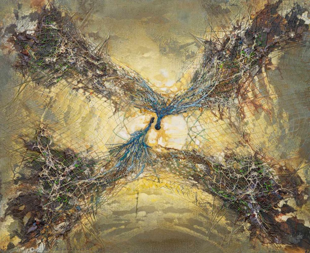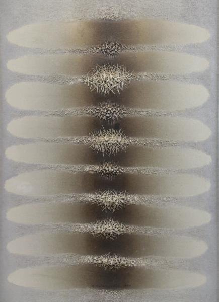 Dwie kompozycje fakturalne Zdzisława Salaburskiego z podobnego okresu (1965 i 1966). Powyższa nosi nazwę ‘The Web of life’ zaś poniższa ‘Struggle’. Wydaje mi się, że obydwie nazwy prac nie zostały jednak nadane przez autora a raczej przez właściciela. Warto zwrócić uwagę na powiększenia fragmentów by lepiej zrozumieć złożoną facturę każdej z prac.