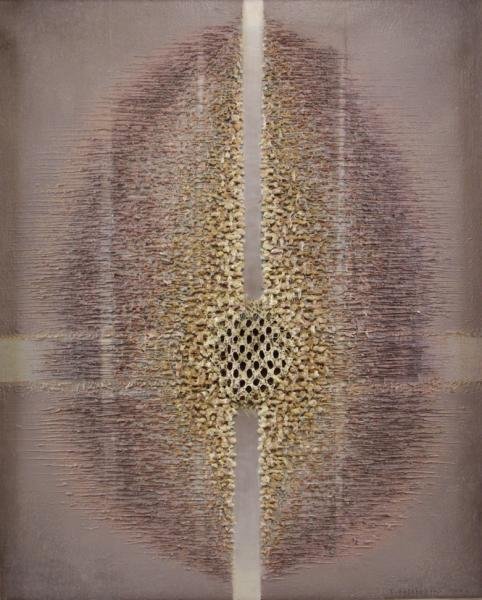 Lot 870. Salaburski, Zdzislaw. 1922 Czestochowa-2006 Warszawa. Abstrakte Komposition. 1968. Assemblage/Materialbild/Öl/Acryl, Netz, re. u. sign. u. dat. Verso nochmals sign., dat. und lok. “Warszawa”. 92,5 x 73 cm. Gerahmt. No reserve. Dresdener Kunstauktionshaus Günther. 2/25/15.