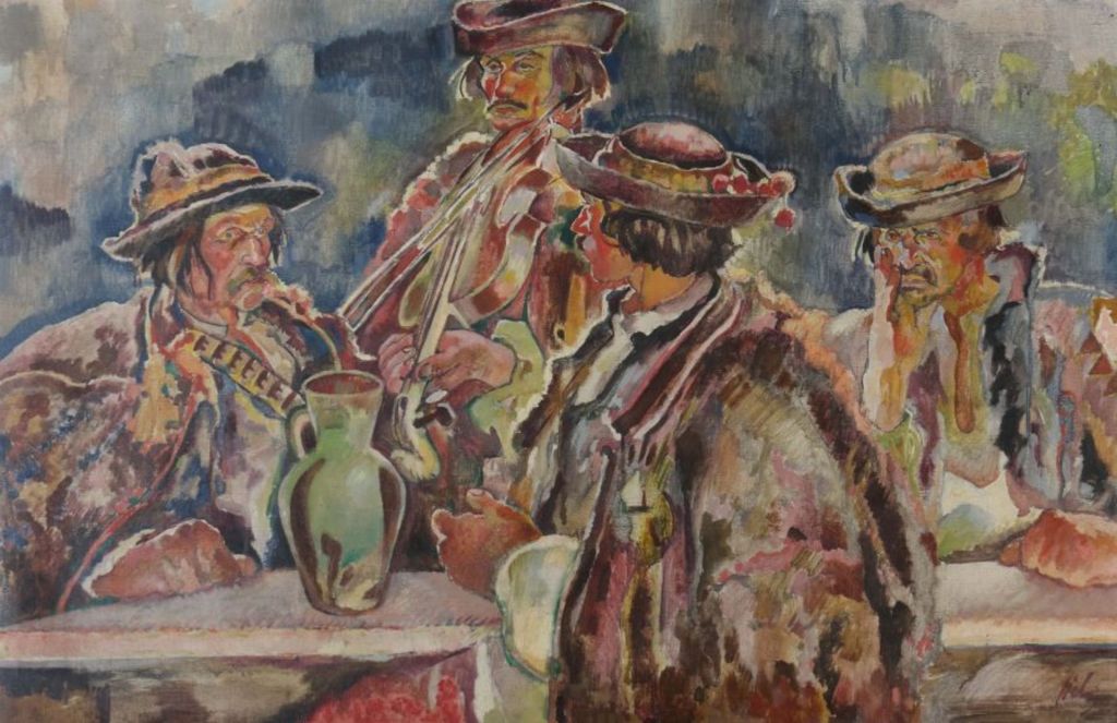 Lot 2187. Sichulski, Kazimierz Lemberg 1879 – 1942 ebenda, polnischer Zeichner und Maler, Stud. an der AdBK in Krakau unter Stanislaw Wyspianski und Leon Wyczólkowski, Reisen u.a. nach München. “Huzulen”, Gruppe von vier Männern in Volkstracht der Huzulen (Bergvolk der Kapaten), drei um einen Tisch sitzend, der vierte eine Fidel spielend, auf dem Tisch ein Tonkrug stehend, Öl/Leinwand, HxB: 79/119 cm. Farbabplatzer im Randbereich. Auf Keilrahmen aufgezogen. Provenienz: Aus der Privatsammlung eines Kunsthändlers in Lódz, tätig Anfang des 20. Jh. und seitdem in Familienbesitz.