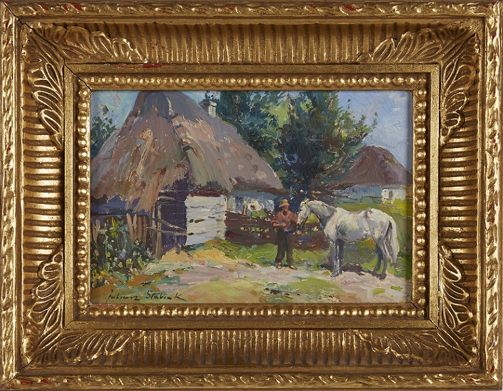 Trzy całkiem niezłe, “eksportowe”, oleje Juliusza Słabiaka, krakowskiego malarza i nie zdziwiłbym się, gdyby wróciły do krakowskiej galerii. Jeden obraz jest opisany a dwa nieopisane przez dom aukcyjny (bez wymiarów choć to oleje na płótnie, mogą być równie duże prace jak ten opisany) co świadczy o profesjonaliźmie domu aukcyjnego na Florydzie. Akurat te trzy oleje są niezłe i śmiem twierdzic dużo lepsze od niektórych prac innych krakowskich, poważanych w galeriach, koniarzy. Artysta, moim zdaniem, wpatrywał się w prace Fałata a także Józefa Brandta (zwłaszcza ten środkowy pobraz). Zmiana werniksu na pewno pomoże tym trzem pracom.