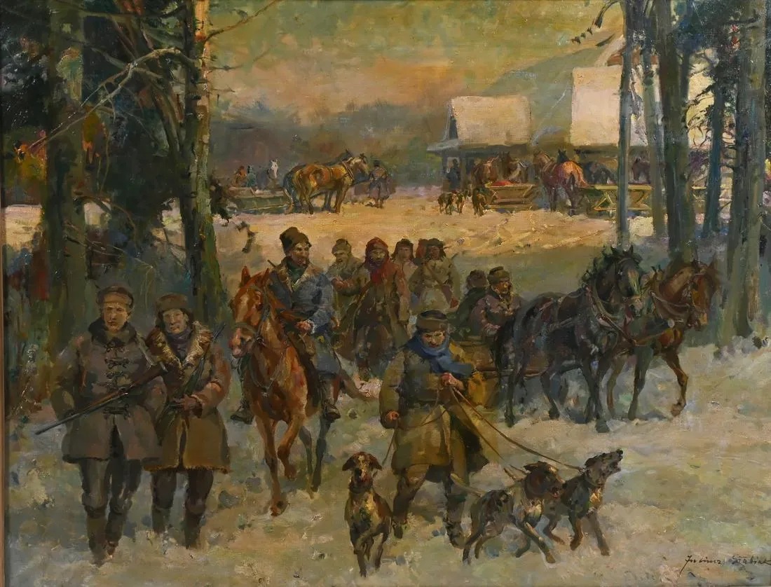 Juliusz Słabiak. Winter Genre Hunting Scene with Horse-Drawn Sleds, Hunting Dogs, and Hunters on Horseback